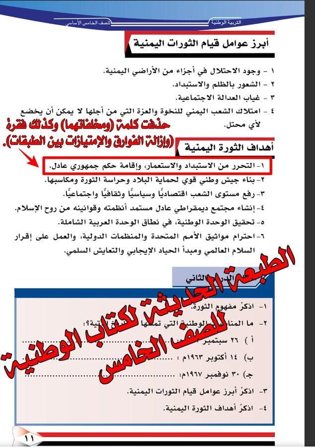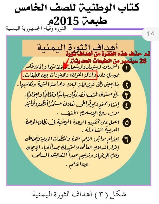 وتداول ناشطون على مواقع التواصل الاجتماعي صورا لكتاب الوطنية للصف الخامس الابتدائي، في المنهج الدراسي المعدّل من قبل مليشيا الحوثي، كشف عن إزالة المليشيا لفقرات من أهداف الثورة اليمنية الخالدة.