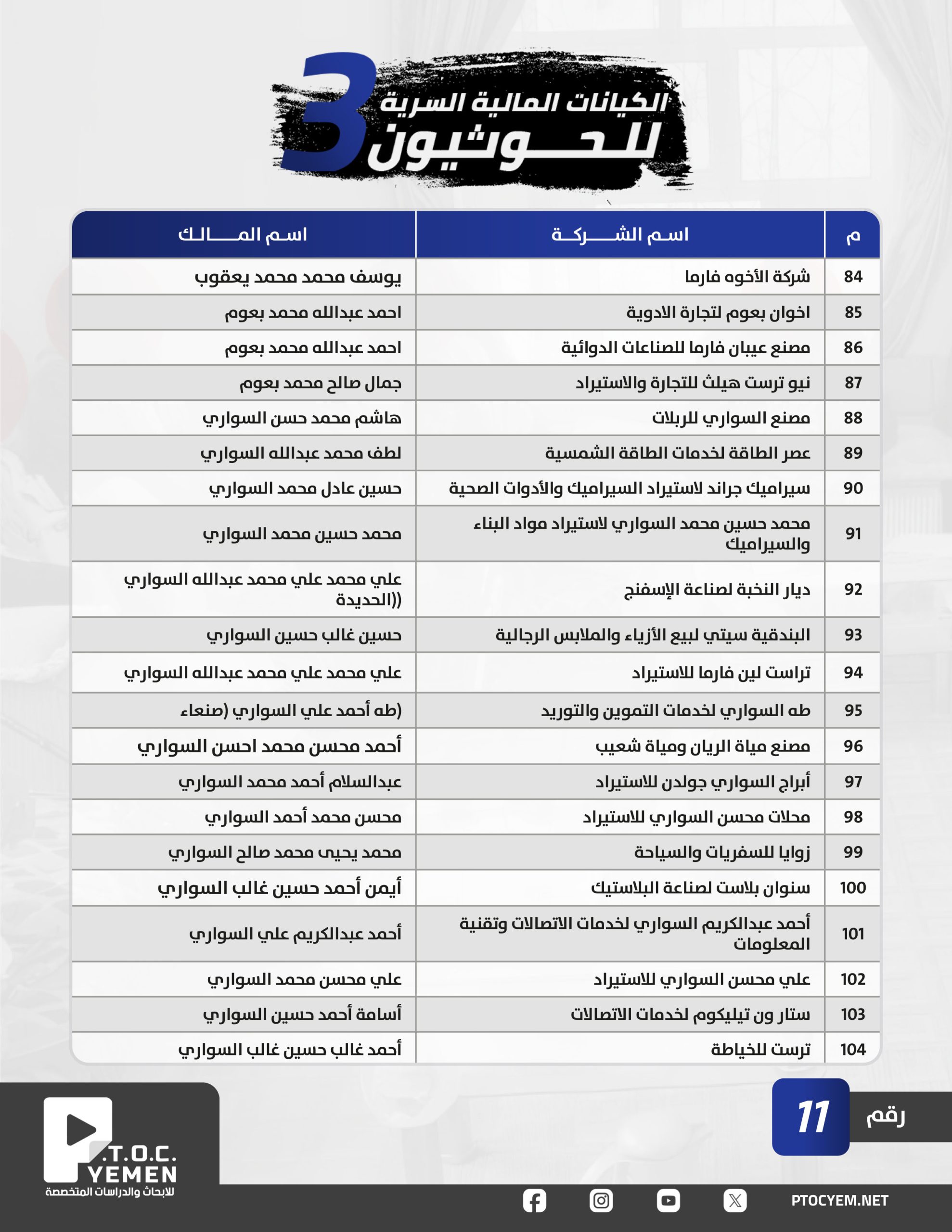ويوثّق الجزء الثالث من تقرير “الكيانات المالية السرية للحوثيين” إنشاء الحوثيين حوالي 200 شركة جديدة في مختلف القطاعات الاقتصادية، مسجّلة بأسماء شخصيات موالية لهم أو مقرّبين من قادتهم، بهدف الالتفاف على العقوبات الدولية والقيود المفروضة على الكيانات المرتبطة بهم، وذلك منذ اندلاع الصراع واجتياح العاصمة صنعاء ومحافظات عدّة في سبتمبر عام 2014 وما تلاه من حرب دامية في مارس عام 2015.