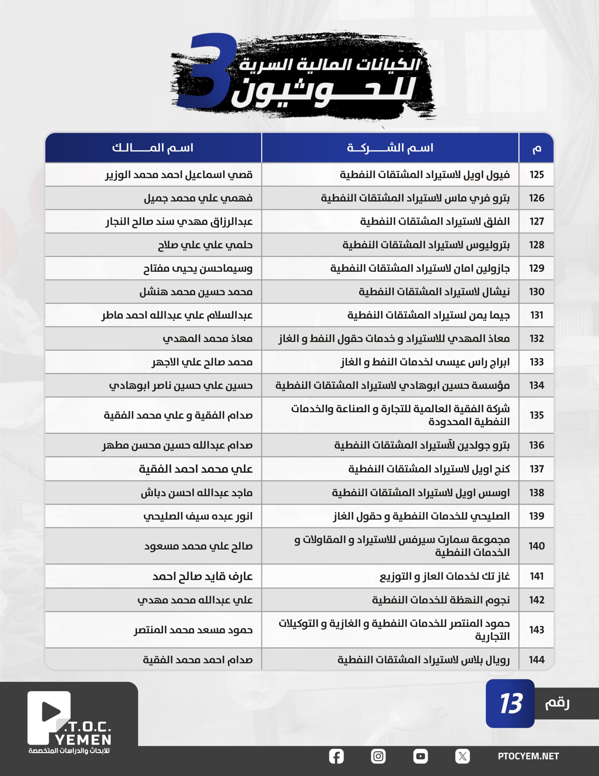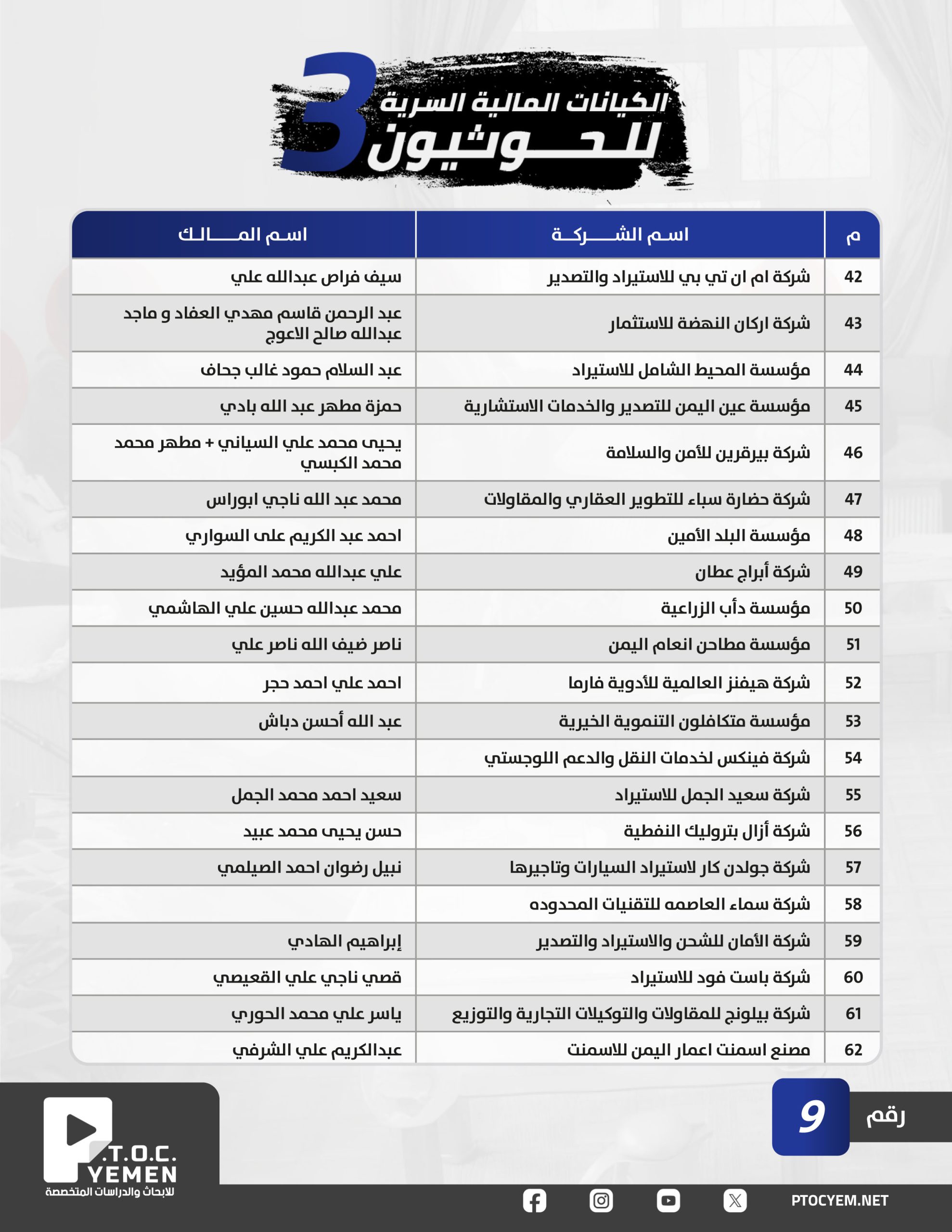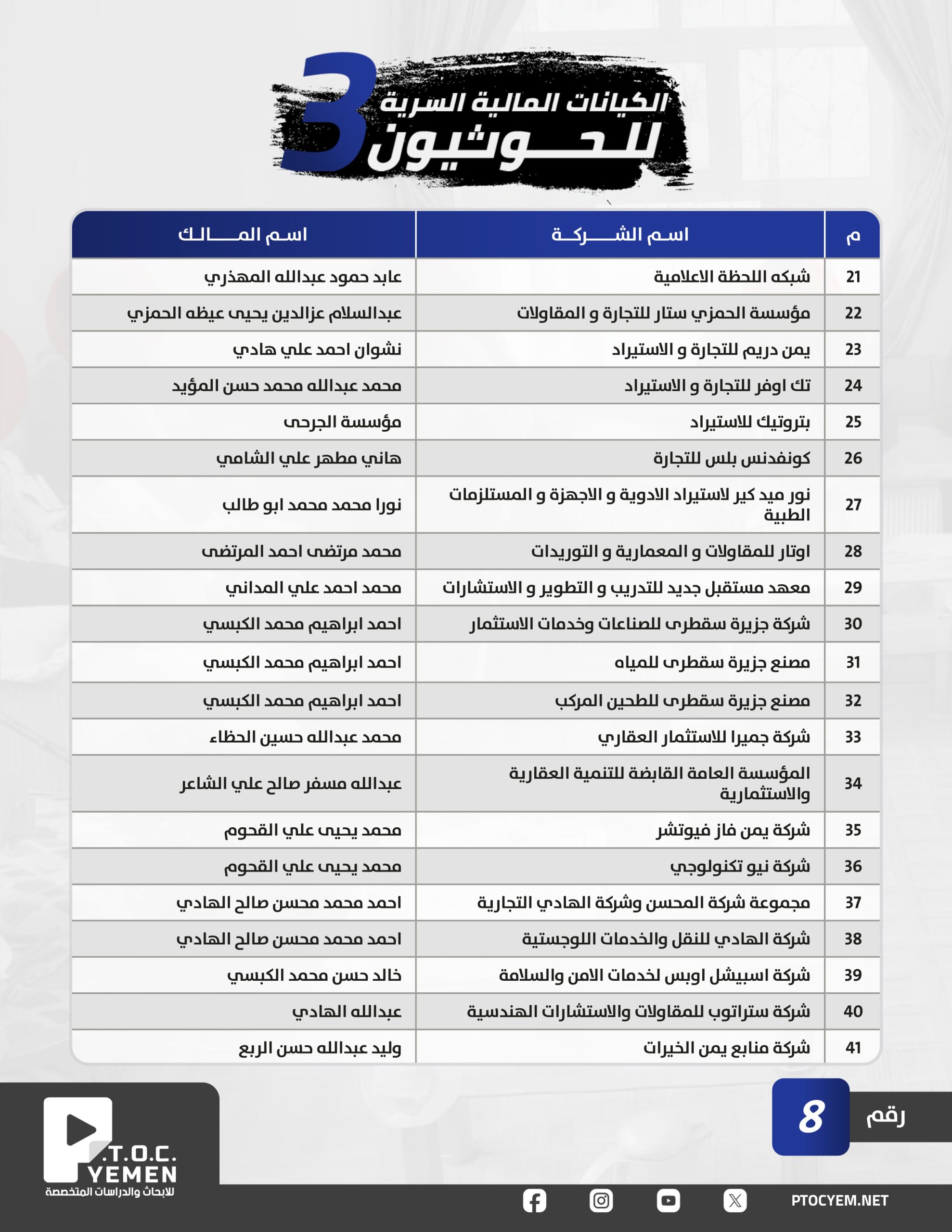 تقرير مركز (P.T.O.C.YEMEN) يكشف شبكة مالية سرية للحوثيين تشمل 200 شركة