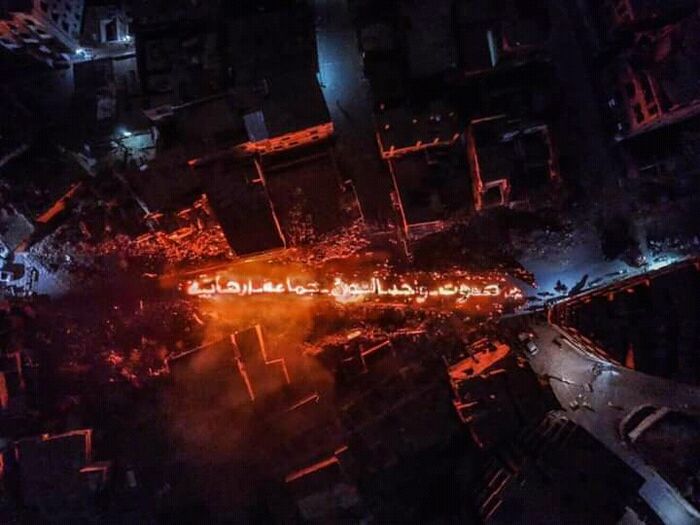 إلى ذلك، رسم المحتجون، شجرة عيد الميلاد على أنقاض دمار هائل في حي الجحملية شرقي المدينة أحد أشد الأحياء دمارا في المحافظة.