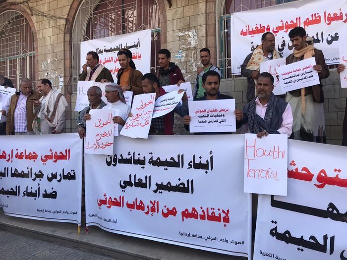 كما طالب المحتجون، المجتمع الدولي والمبعوث الأممي ومنظمات حقوق الإنسان، القيام بواجباتهم الإنسانية، والتدخل لوقف جرائم الحوثي المستمرة بحق أبناء الحيمة.