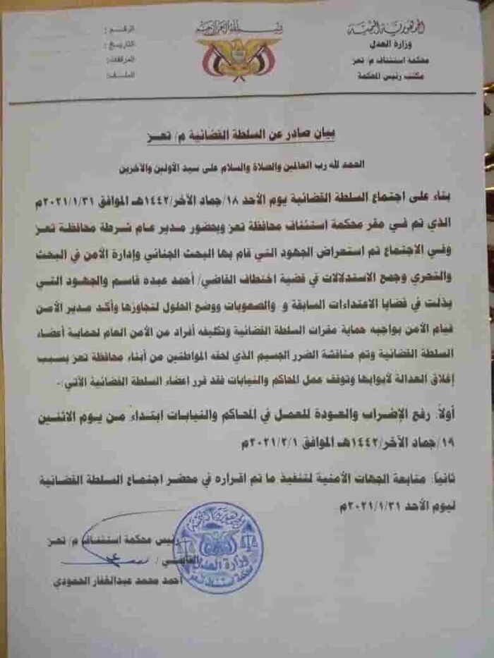 بعد اجتماع السلطة القضائية بمحافظة تعز يوم امس الاحد أعلنت رفع الإضراب والعودة للعمل في المحاكم والنيابات ابتداءً من اليوم الاثنين