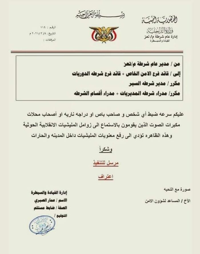 وبحسب التعميم الذي تداولته عدد من وسائل الإعلام المحلية، فقد حث التعميم الصادر عن إدارة الشرطة، مدراء الأقسام، وشرطة الدوريات، وشرطة السير على إعتقال المخالفين لهذا التعميم، و"ضبط أي شخص وصاحب باص ودراجة نارية أو أصحاب محلات مكبرات الصوت الذي يقومون بالاستماع إلى زوامل المليشيات الإنقلابية".