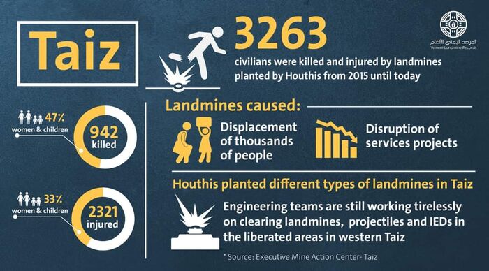 جراء الغام الحوثيين مقتل وإصابة أكثر من ثلاثة آلاف مدني بتعز