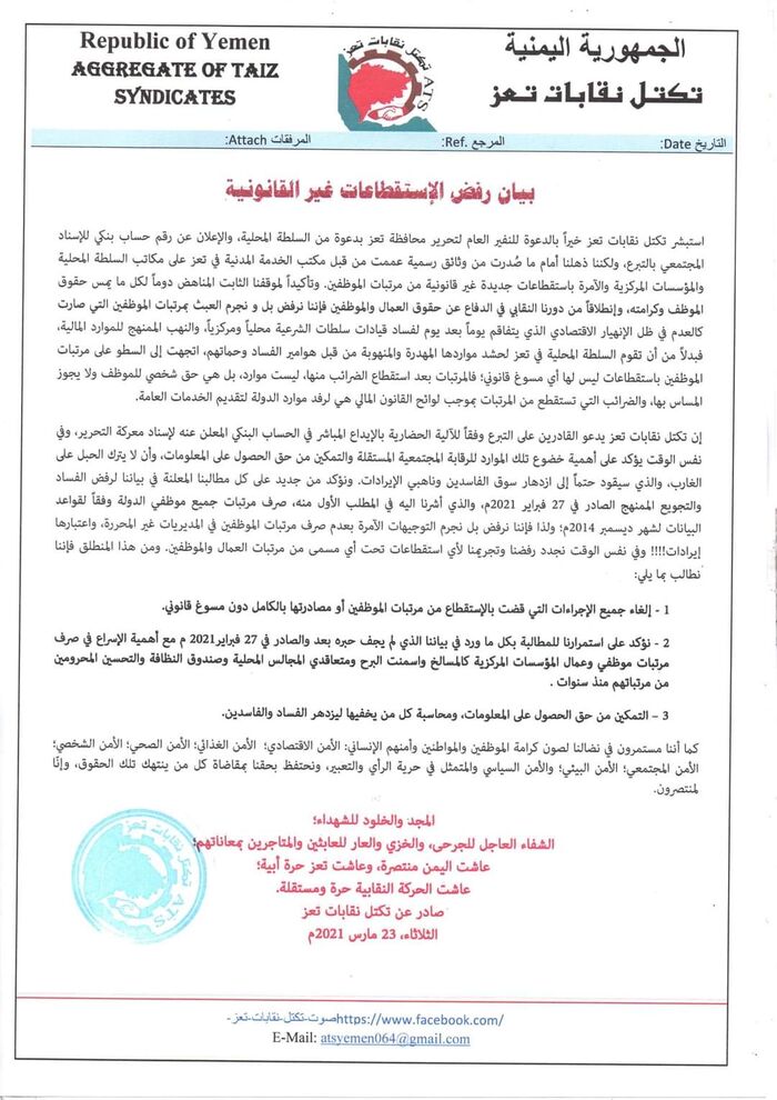 وجاء في البيان "استبشر تكتل نقابات تعز خيراً بالدعوة للنفير العام لتحرير محافظة تعز، بدعوة من السلطة المحلية، والإعلان عن رقم حساب بنكي للإسناد المجتمعي بالتبرع، ولكننا ذهلنا أمام ما صُدرت من وثائق رسمية عممت من قبل مكتب الخدمة المدنية في تعز على مكاتب السلطة المحلية والمؤسسات المركزية والآمرة باستقطاعات جديدة غير قانونية من مرتبات الموظفين".
