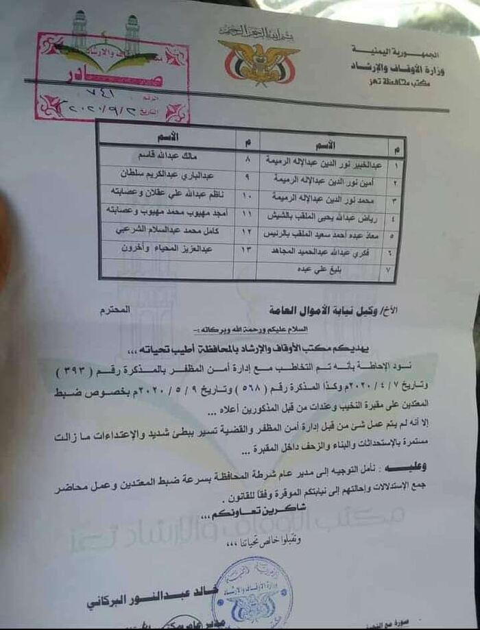 وقالت النيابة ان المتهمين بالاعتداء على مقبرة نخيب وعندات الحاضر من قبل مكتب الاوقاف بتعز هم