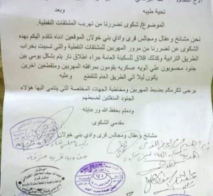 وأظهرت وثيقة، تداولها ناشطون، في وسائل التواصل الاجتماعي، شكوى أهالي ومشايخ قرى “وادي بني خولان”، في مديرية جبل حبشي، إلى مدير المديرية، ومدير الشرطة فيها، أن “وايتات” ومقطورات المشتقات النفطية، يتم تهريبها إلى مليشيا الحوثي، بمرافقة جنود محسوبين على ألوية عسكرية، مسيطرة على تلك المناطق المحررة.