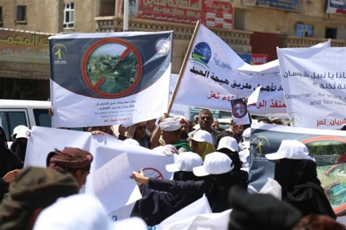 وفي التظاهرة التي نظمتها "حملة جسد واحد ومنظمات المجتمع المدني بمديرتي الشمايتين والمقاطرة"، هتف المشاركون بعبارات تطالب بسرعة إنقاذ شريان تعز الوحيد من الإنهيار.