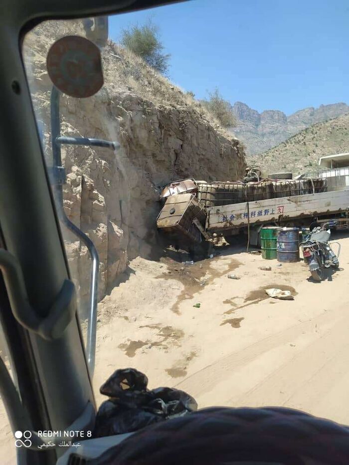 تداول ناشطون محليون على مواقع التواصل الاجتماعي صورة لشاحنة تحمل بنزين كادت أن تتسبب بكارثة على طريق هيجة العبد في تعز.