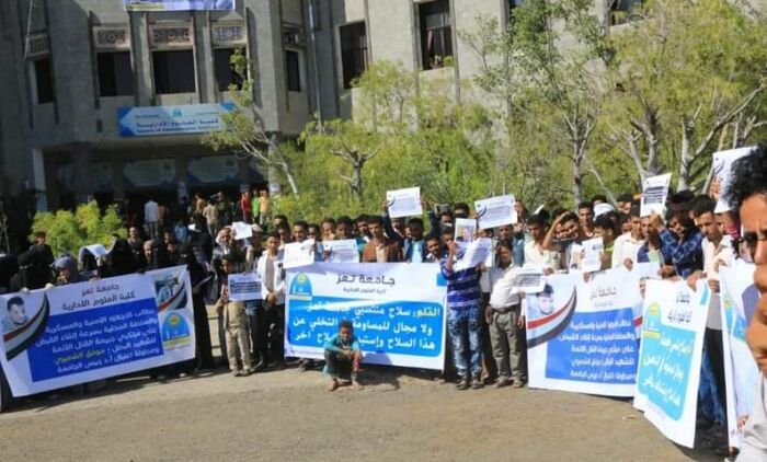 ضمن سلسلة من الوقفات الإحتجاجية التي تنظمها كافة كليات جامعة تعز، نظمت صباح اليوم السبت، كلية العلوم الإدارية، أولى وقفاتها الإحتجاجية للمطالبة بسرعة إلقاء القبض على مرتكبي حادثة محاولة إغتيال رئيس الجامعة أ.د/ محمد الشعيبي وإستشهاد مرافقه الشخصي موفق الشميري .