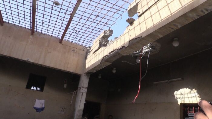 تبرز آثار القصف بشكل واضح على مبنى السجن من الخارج، ومن الداخل تبدو آثار القصف واضحة أيضاً على واجهة الأقسام والعنابر. فالجوع والمرض وغياب الاهتمام وغياب الحقوق ليست وحدها ما يحاصر النزلاء، فالقذائف العشوائية التي تطلقها مليشيات